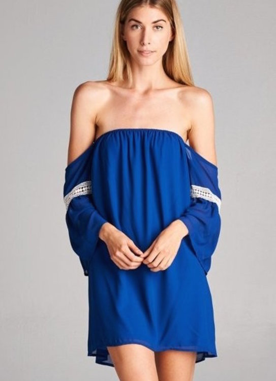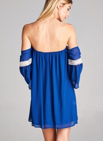 Blue off-the-shoulder top with white crochet details on the arms. Pairs great with jeans or black pants!