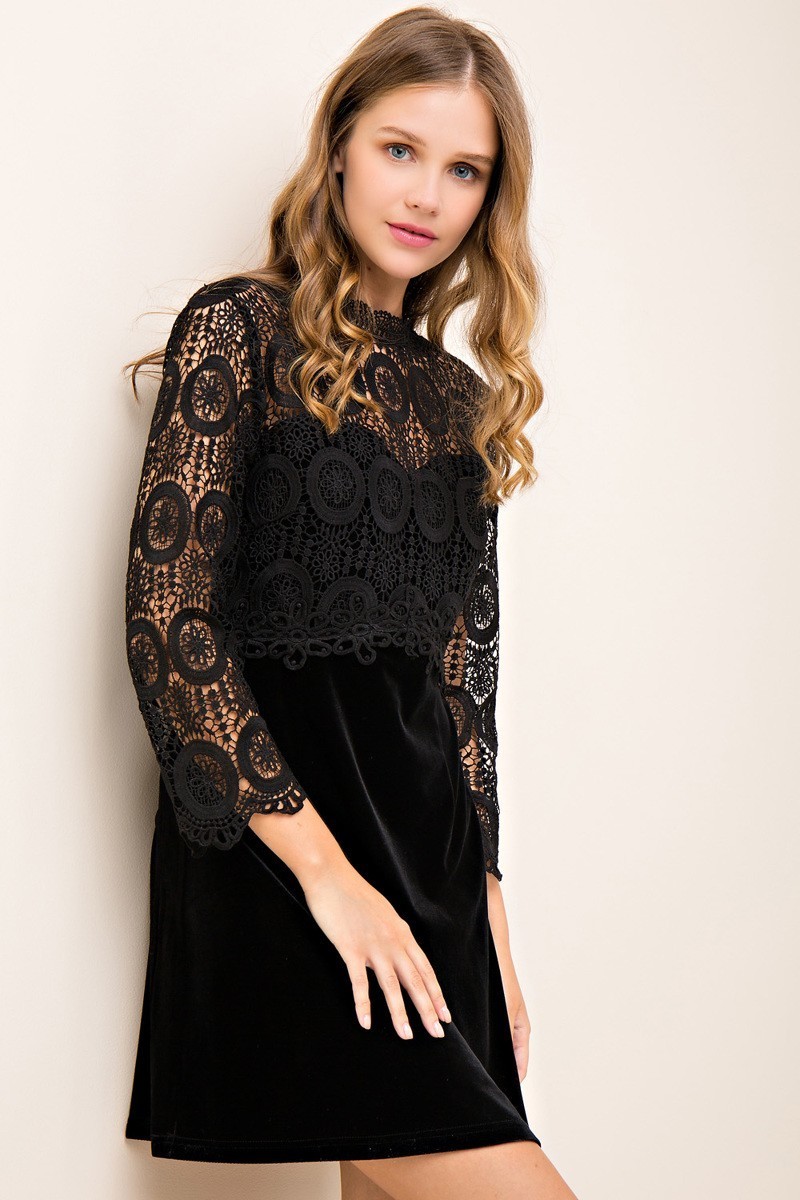 Solid velvet a-line dress featuring contrast crochet fabric. Open back with keyhole double-button closure and zipper. Partially-lined. Non-sheer. Partially see-through. Knit/Woven mixture. Lightweight.