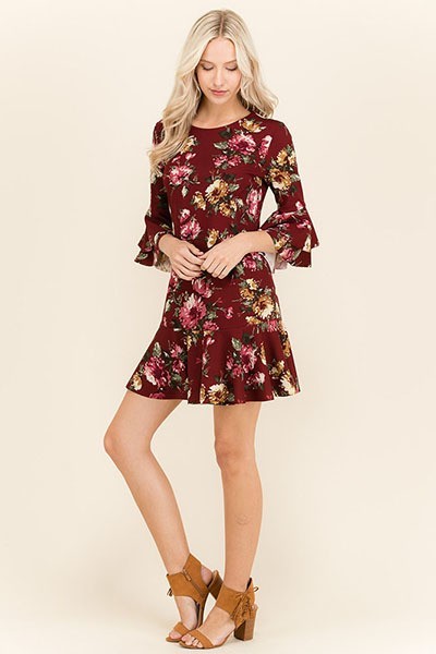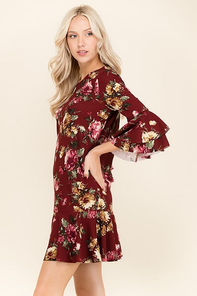 Girly Lightweight Woven Dress with Ruffle Mermaid Hem and Bell Sleeves in Autumn Floral Print.